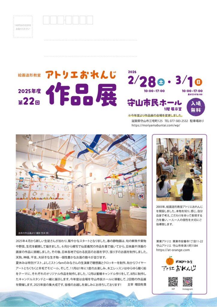 2026年2月5日 / 最終更新日時 : 2026年2月5日 orange お知らせ 第22回作品展開催します 2026年2月28日土曜日・3月1日日曜日 10時~17時(最終日は16時まで受付) 今年は守山市民ホール展示室で2日間開催します。 入場無料です。皆様のお越しをお待ちしております!